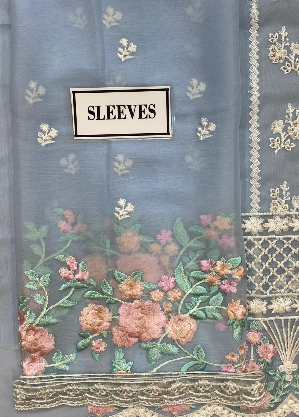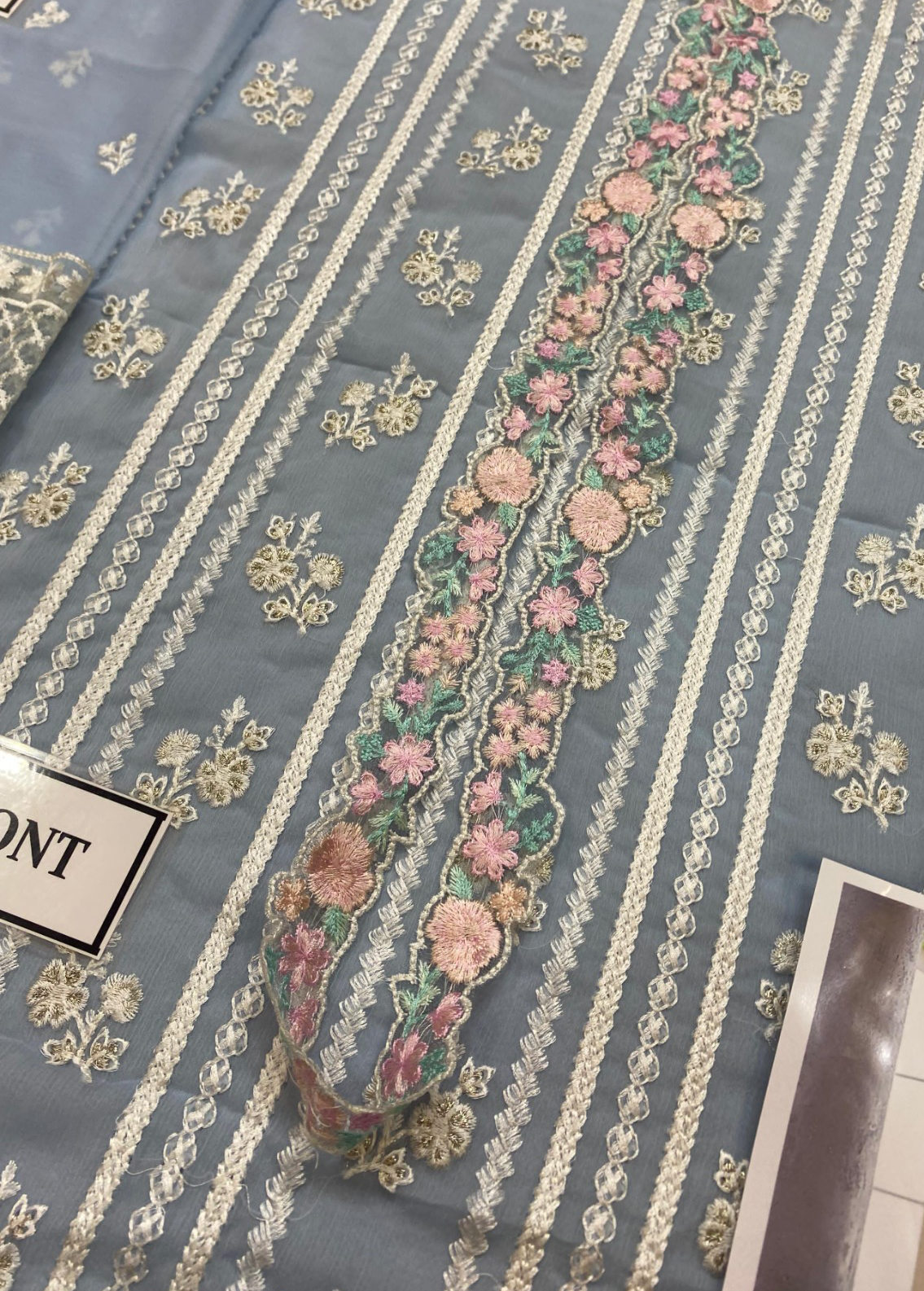 A matching Chiffon Embroidered Dupatta With Organza Embroidered Border for Dupatta Pallu, & Crape Trouser With Organza Embroidered Border for trouser to make your look Modest and Elegant.